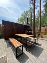В стоимость аренды входит электрический чайник, 3 килограмма угля для мангала, 10 килограмм дров, одноразовые стаканы, тарелки, ножи и вилки, шампура. Кроме того, за отдельную плату вы можете приобрести дрова, уголь, решетку, а также взять кальян в аренду.